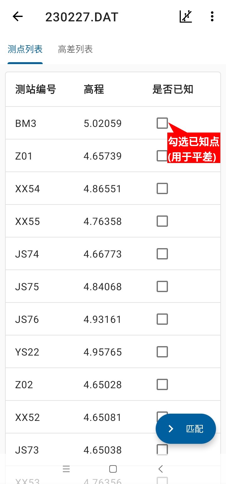 - 当打开数据浏览界面时已经绑定了一个监测任务,App 将自动从后台静默查询平台系统上该测组所预设的基准点,若查询到的基准点能与该原始文件内的记录点点名匹配上,App 将会自动将该点的高程值替换为平台预设的基准点高程,并勾选为已知点。