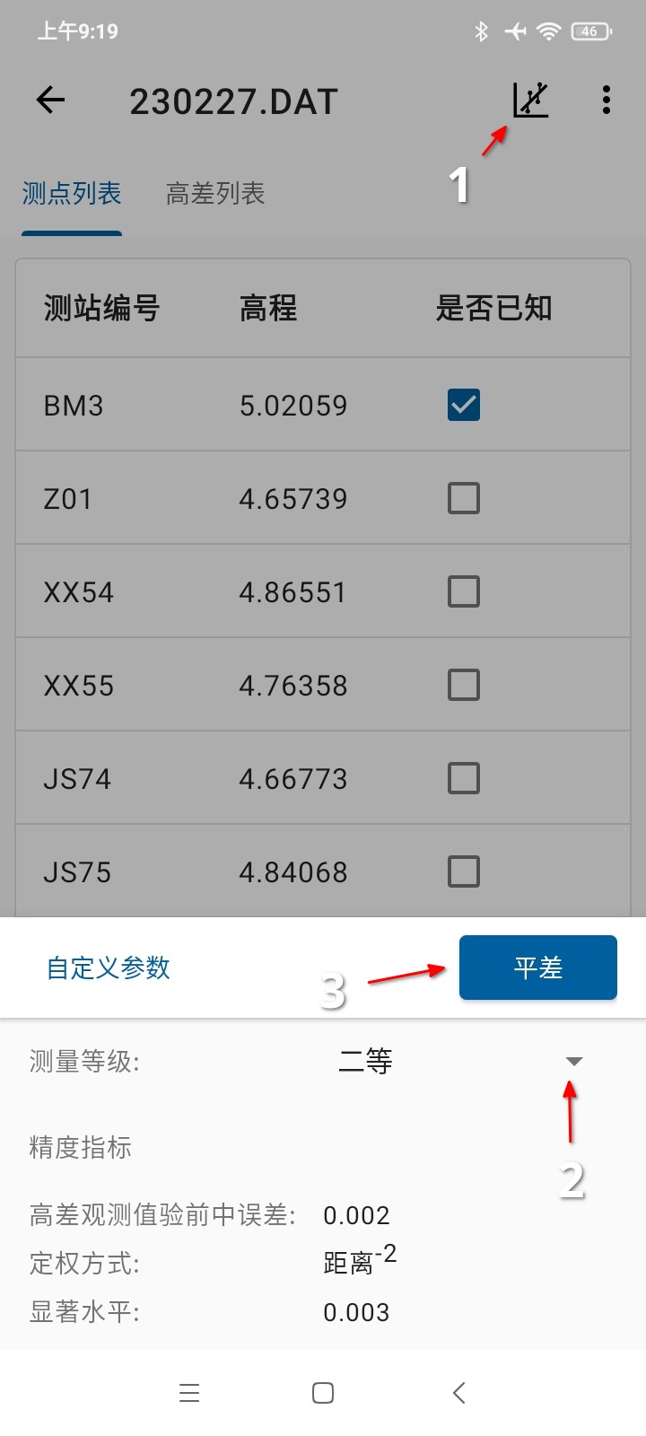水准测量数据浏览界面除了读取 .dat 文件并展示测量点高程及高差数据外,还可修改测量点点名、进行数据平差等操作。