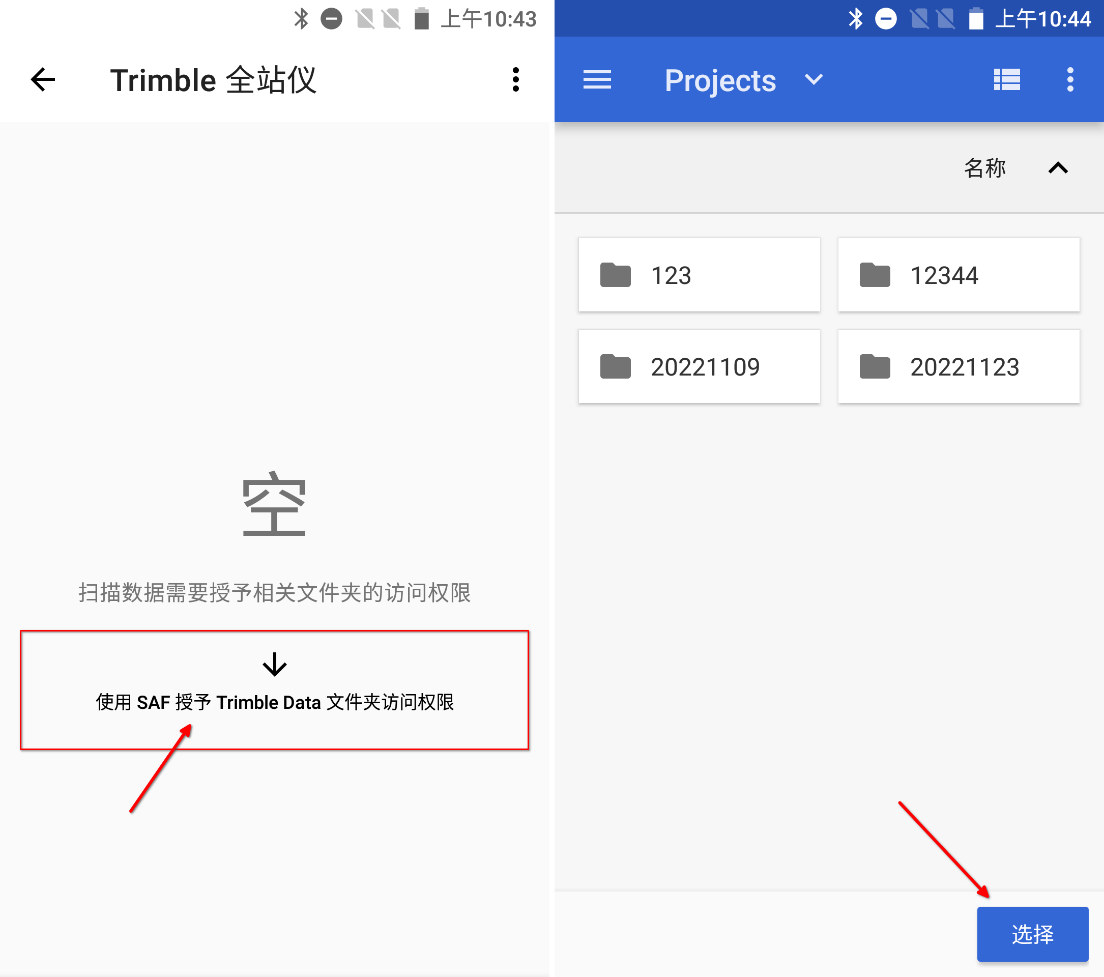 数据不落地 App 会自动读取 Trimble Access 导出的数据文件夹,并列出可用的数据项。第一次使用时需要授予相关文件夹的访问权限,使用 Android 的存储访问框架(SAF)简单操作两步即可完成授权。