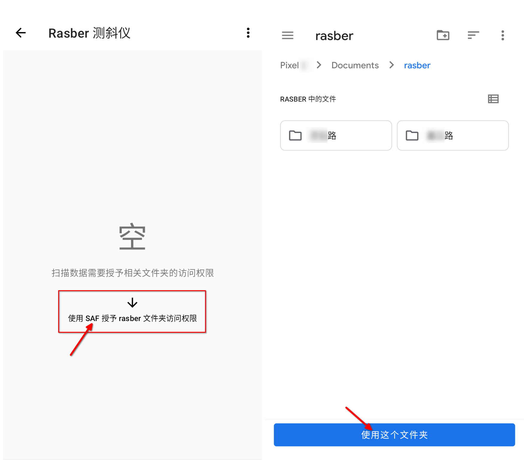 若用户在本机安装了瑞茨柏测斜读数仪 App 并已导出成果数据到其默认的公共目录(内部共享存储空间/Documents/rasber/)下,那么数据不落地 App 可直接扫描并列出该目录下的数据。第一次使用时需要授予相关文件夹的访问权限,使用 Android 的存储访问框架(SAF)简单操作两步即可完成授权。