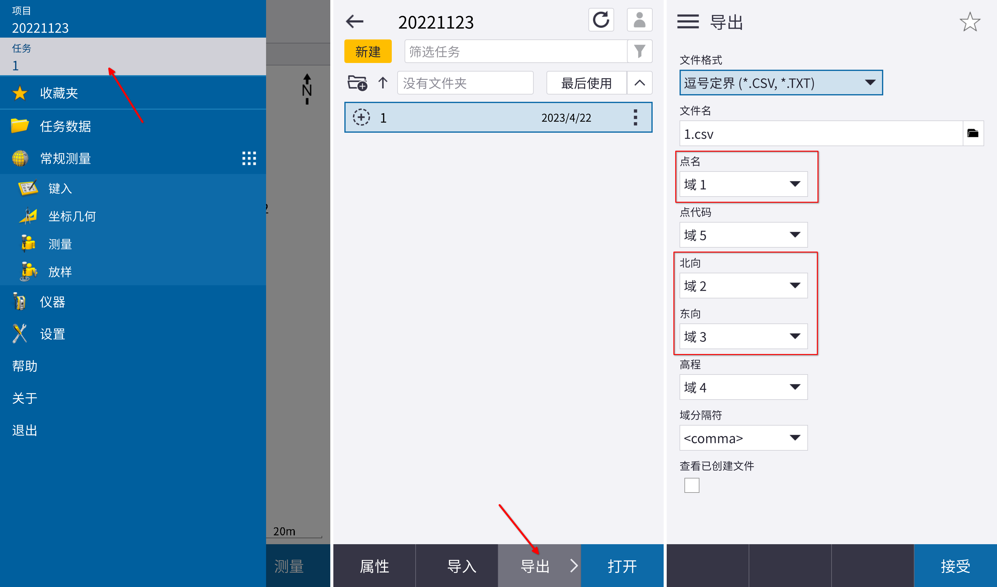 完成全站仪测量作业后,从 Trimble Access 中导出数据:在侧边菜单中点击“任务”项,进入任务界面;在任务界面点击“导出”按钮,进入数据导出界面;在数据导出界面,选择逗号定界 (*.CSV, *.TXT)文件格式,确认“点名-域1, 北向-域2, 东向-域3”,其他选项默认即可。